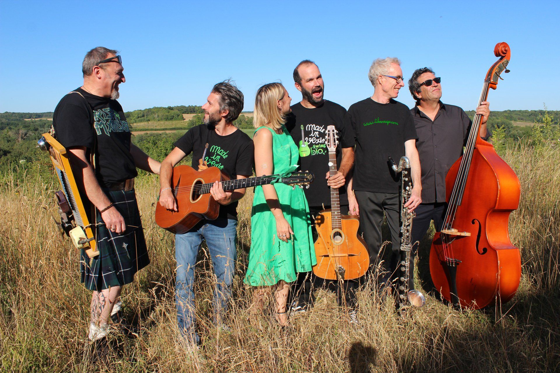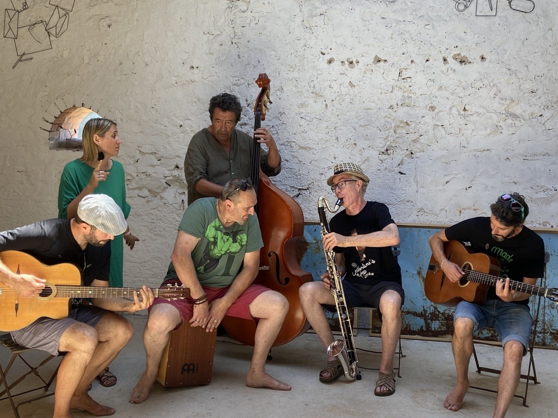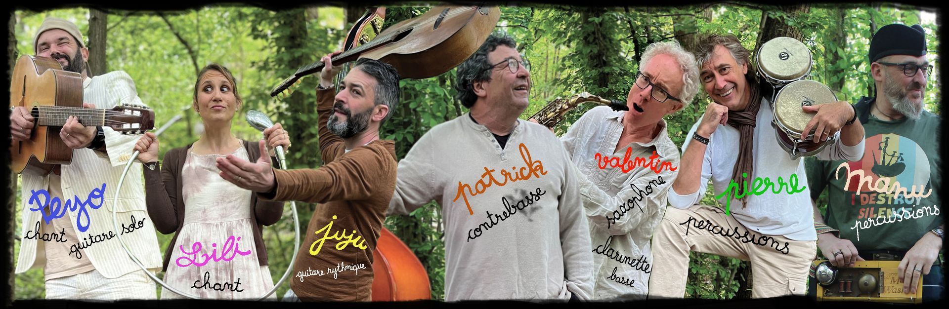 2 voix, 1 clarinette, 2 guitares, 1 contrebasse, et un duo de percussions et 7 musiciens en folie....